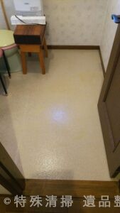 作業内容としては、まず血液および体液が付着した床面の除去・清掃を実施し、その後、専用薬剤を用いた消毒・除菌作業を行い、臭気や衛生リスクの低減に努めた。クッションフロアについては素材の特性を考慮し、必要以上の損傷を与えないよう慎重に作業を進めた。作業完了後には、目視および臭気確認を行い、日常生活に支障のない状態まで回復させている。